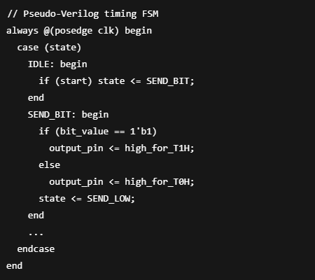 Verilog FPGA logic (.v or .sv) — responsible for generating WS2812-compliant bit patterns.