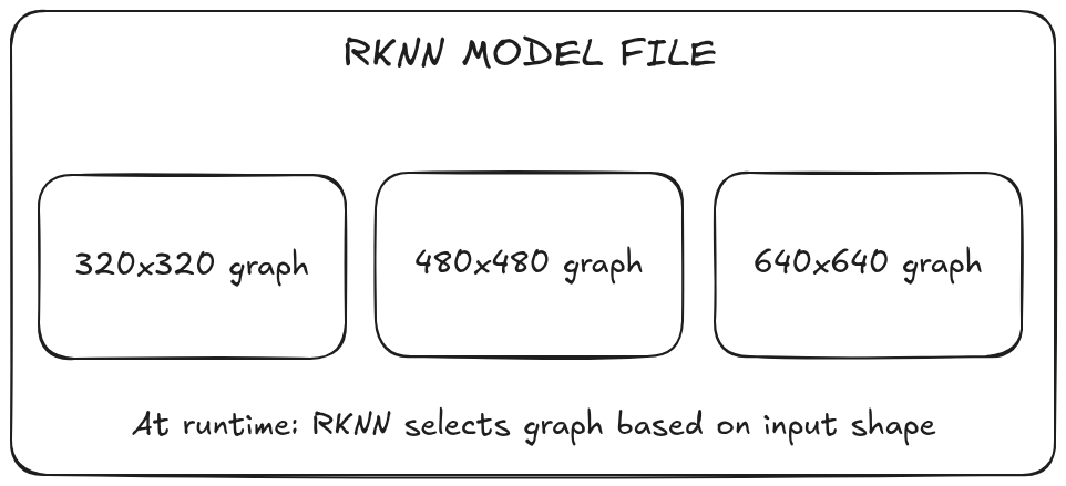 RKNN doesn't support true dynamic shapes like ONNX. Instead, it uses "discrete dynamic input"—you pre-define all input shapes at conversion time, and RKNN compiles a separate optimized graph for each: