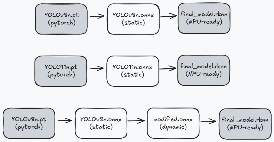 YOLO11n follows a similar pattern, but with a key limitation: only single static shapes work reliably. The dynamic conversion step fails to produce valid multi-shape RKNN models.